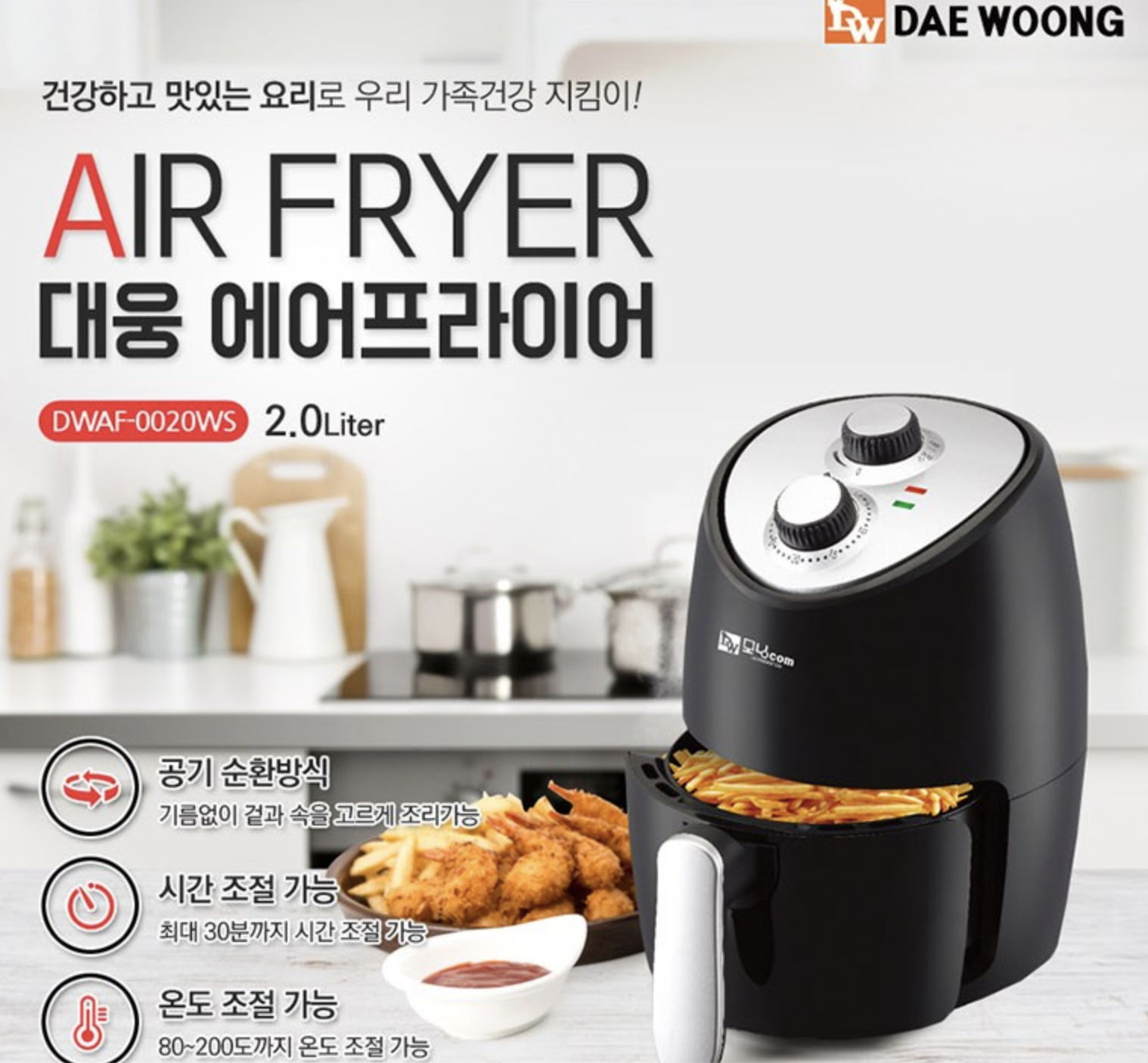 이제품은 지인에서 선물받은 제품인데 약 1년정도 사용한거 같아요. 전에 사용하던게 고장난듯 잘 안되서 하나 사려고 하던때에 아주 적절히 선물을 받았습니다. 부모님집에는 가보니 대용량 에어프라이어가 있던데 이건 용량이 좀 작은듯 해요. 큰거는 4-5리터정도 되는거 같은데 이건 2리터 용량입니다. 이정도면 1-2인용으로 딱인듯 한데 저희는 먹는 양이 좀 많아서 작네요ㅜㅜ 하지만 작은만큰 공간도 차지 하지 않아서 전기밥솥 놓는곳에 같이 둘수 있어서 딱 좋습니다.