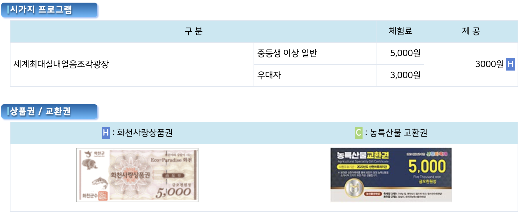 입장료가 비싸지 않은듯 한데 상품권으로도 돌려주니 받은 상품권으로 썰매나 다른 체험들도 즐길수 있을듯 합니다.